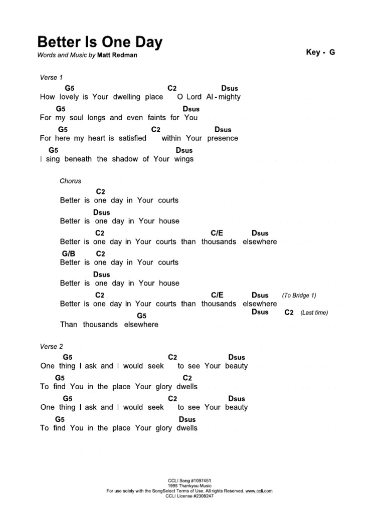 Better is one day (key of c). Tabs and sheet music search engine. S0ri d q nainclude ung lyrics search nlng kau s ibang site. For the lord is good and his love endures. Give thanks to him and praise his name. Many years later, better is one day is a staple in praise and worship music. If something sounds terrible, try the opposite. Hey guys, this is pretty accurate im sure! Better is o a ne day in your courts. One th e ing i ask and i would seek, a to see your be b auty. To see your beauty e bsus4 to find you in the place your glory dwells. A bsus4 better is one day in your courts than thousands elsewhere (repeat). If you don't figure it out immediately, that doesn't mean that you never will.